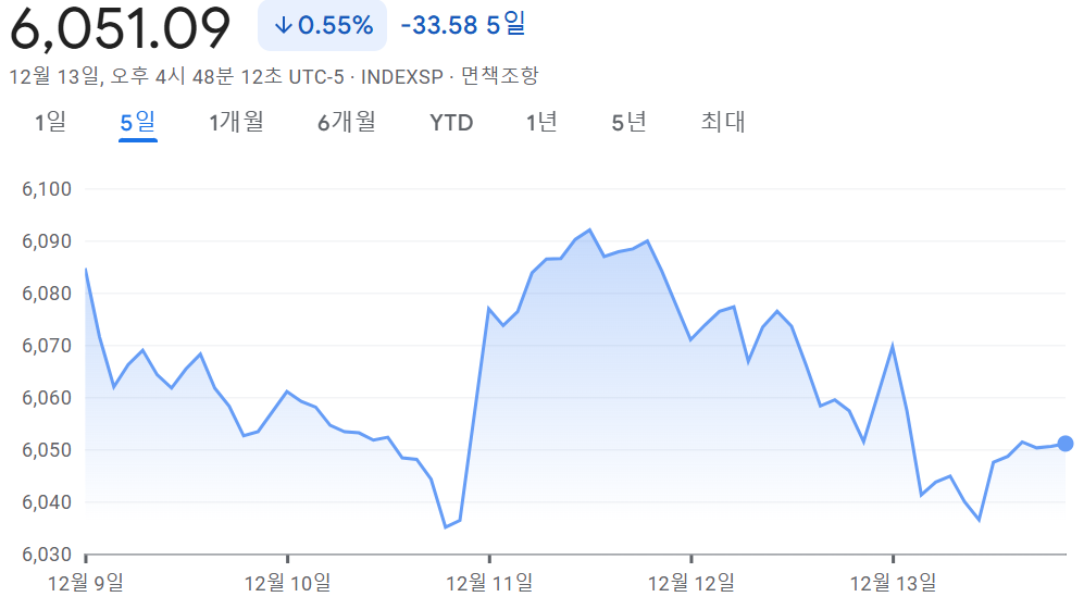 - S&P 500 6,051.09 -0.55% -33.58 5일