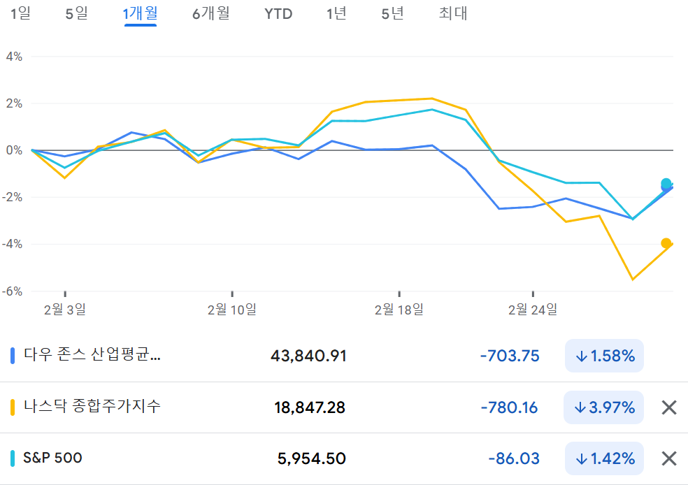 [2025.02] 월간 미국 증시 정리 #나스닥 3.97%↓, #S&P500 1.42%↓, #다우 1.58%↓