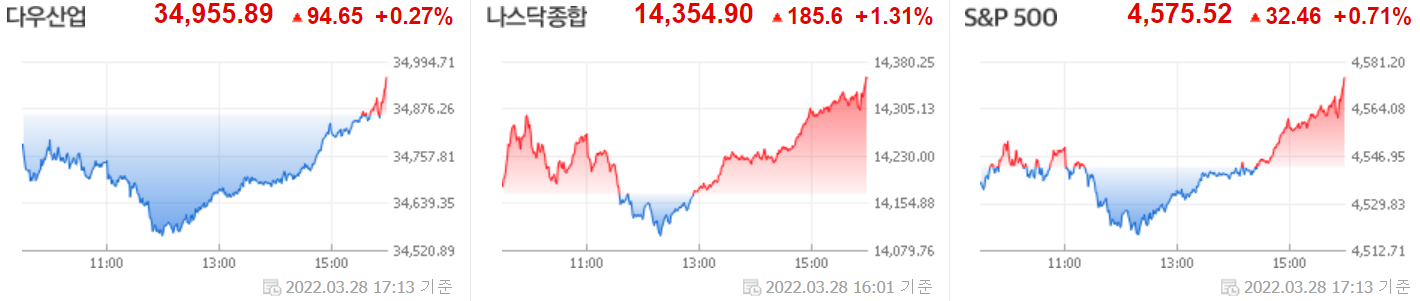 [2022.03.29] 미국 주식 정리 #러 협상 기대·유가 하락에 상승…나스닥 1.31%↑, #상하이 코로나 봉쇄에 국제유가 하락, #테슬라 주식분할, #주요 뉴스