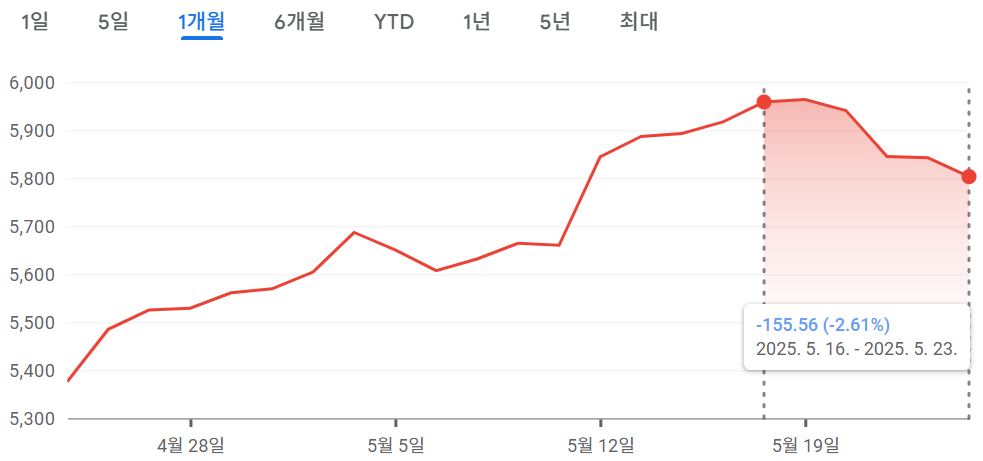 [2024.05.19~2025.05.23] 주간 미국 증시 정리 #나스닥 2.47%↓, #S&P500 2.61%↓, #다우 2.47%↓