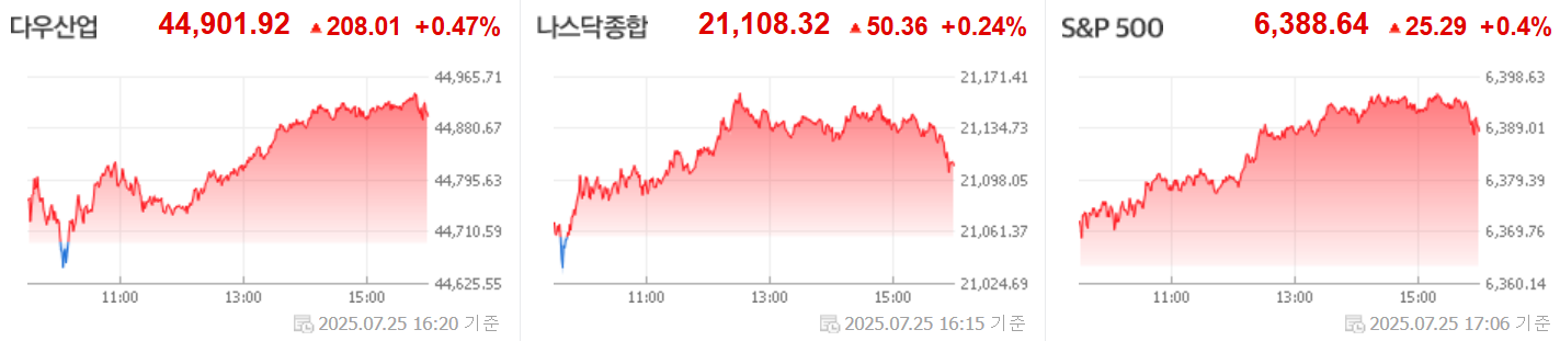[2025.07.26] 미국 주식 정리 #무역협상 낙관에 상승…S&P500지수 5일 연속 최고치, #'경영난' 인텔 파운드리 사업 축소에 주가 8.5% 급락, #올해 주가 2배 뛴 팔란티어 美 톱20 등극