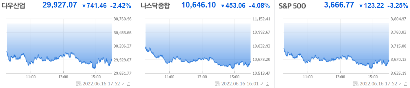 미국 뉴욕증시가 미 연방준비제도(Fed·연준)의 금리 인상에 따른 `안도 랠리`를 하루 만에 마치고 16일(현지시간) 급락했다.이날 뉴욕증시 다우존스30 산업평균지수는 전일 대비 741.46포인트(2.42%)