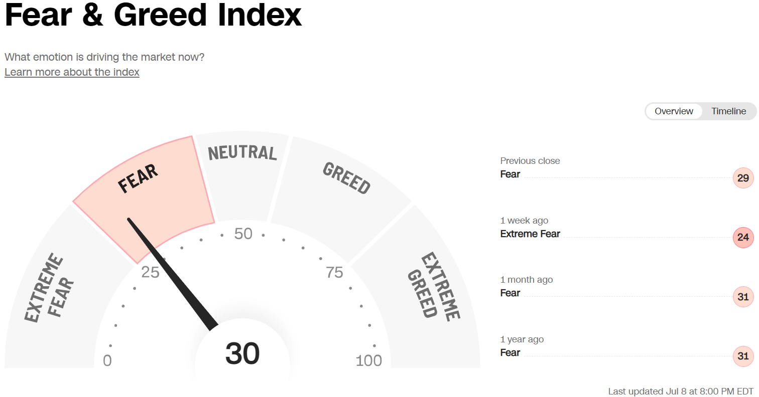 - VIX 지수 20 이하 : 과매수 구간 매도 고려 (흥분 구간)