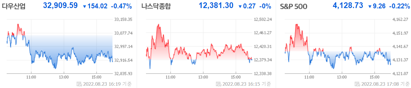 증권 > 해외증시 뉴스: 23일(현지 시간) 미국 뉴욕증시의 주요 지수가 모두 하락했습니다. 유럽의 경기침체 우려가 커진 가운데 투자자들이 잭슨 홀 미팅에서 제롬 파월 연방준비제도(Fed·연준)