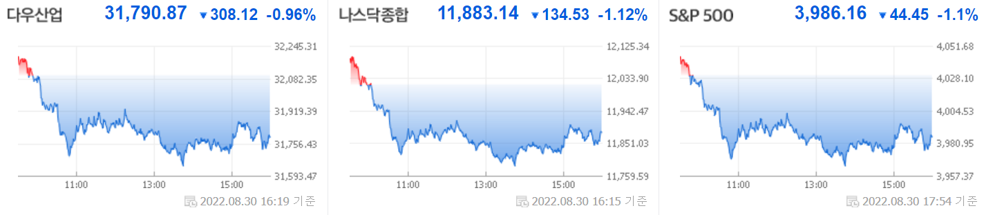 증권 > 해외증시 뉴스: 30일(현지 시간) 미국 뉴욕증시의 주요 지수가 잭슨 홀 미팅 충격파가 지속하면서 또 하락했습니다. 나스닥이 1.12% 빠진 것을 비롯해 스탠더드앤드푸어스(S&P)500과 다우존