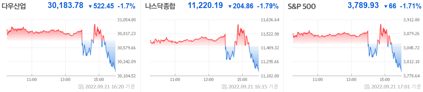 증권 > 해외증시 뉴스: 21일(현지 시간) 미국 뉴욕증시의 주요 지수가 9월 연방공개시장위원회(FOMC) 이후 롤러코스터 장세를 보였습니다. 오후2시 연방준비제도(Fed·연준)의 성명서가 나온 뒤 급락
