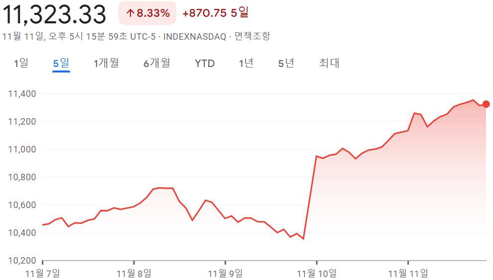 - 나스닥 11,323.33 +8.33% +870.75 5일