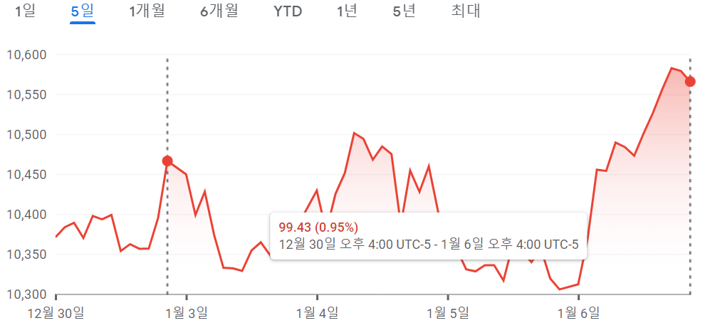 - 나스닥 10,569.29 +0.95% +99.43 4일