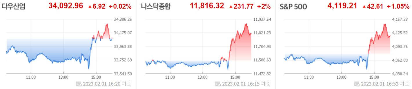[2023.02.02] 미국 주식 정리 #FOMC 결과에 환호…나스닥 2%↑, #美 원유 재고 증가에 하락… WTI 3.12↓, #메타 작년 4분기 매출 예상치 상회…49조원 자사주 매입, #주요뉴스