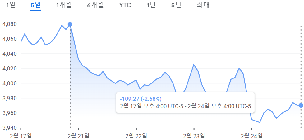 - S&P 500 3,970.04 -2.68% -109.27 5일