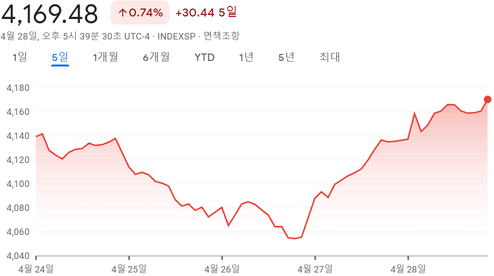 - S&P 500 4,169.48 +0.74% +30.44 5일