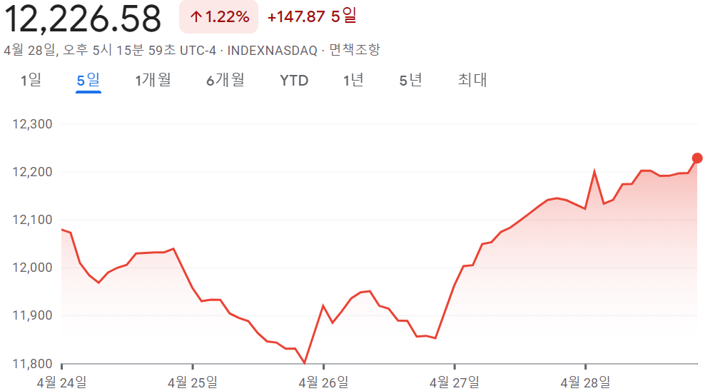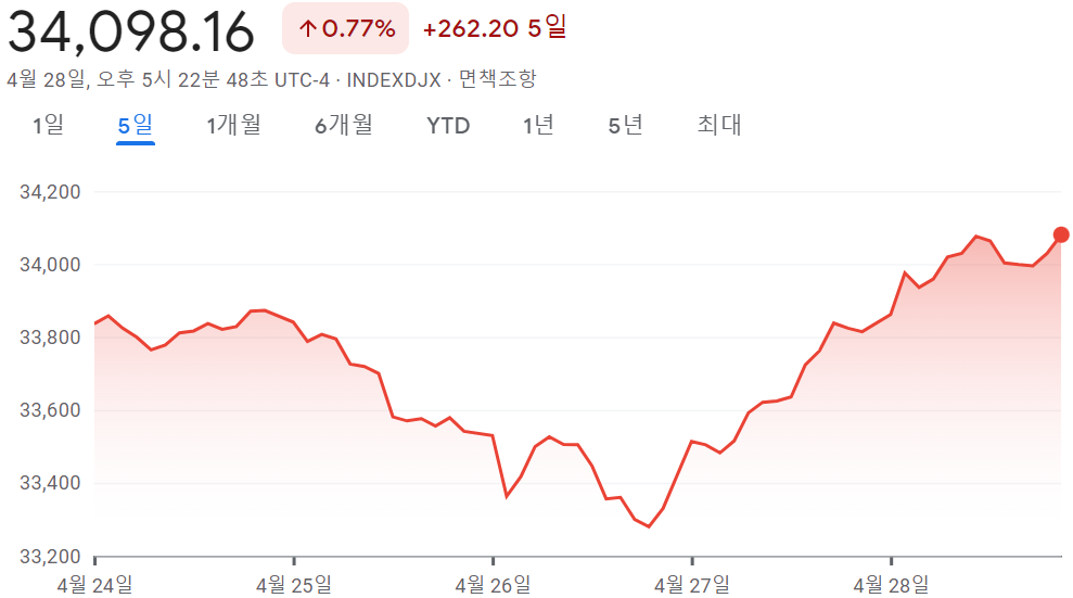 [2023.04.24~04.28] 주간 미국 증시 정리 #나스닥 1.22%↑, #S&P500 0.74%↑, #다우 0.77%↑