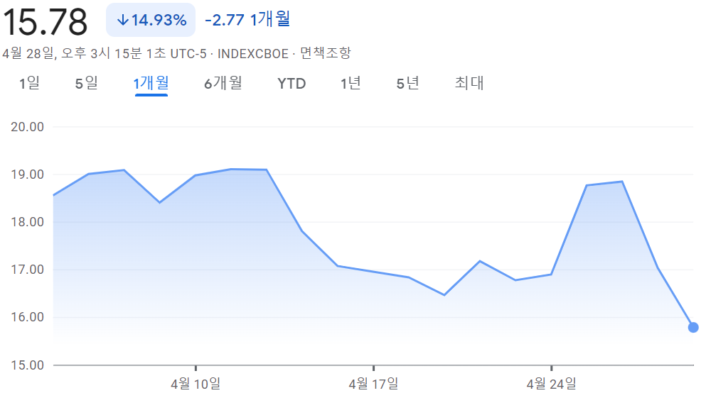 3. VIX 지수 (공포지수) : 대체로 VIX가 높아지면 주가는 폭락하는 경향.