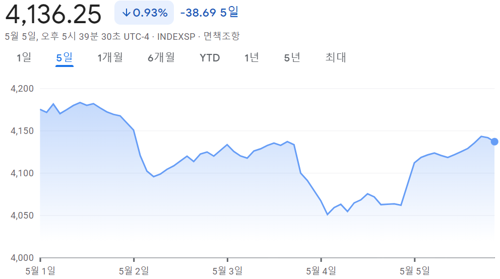 - S&P 500 4,136.25 -0.93% -38.69 5일