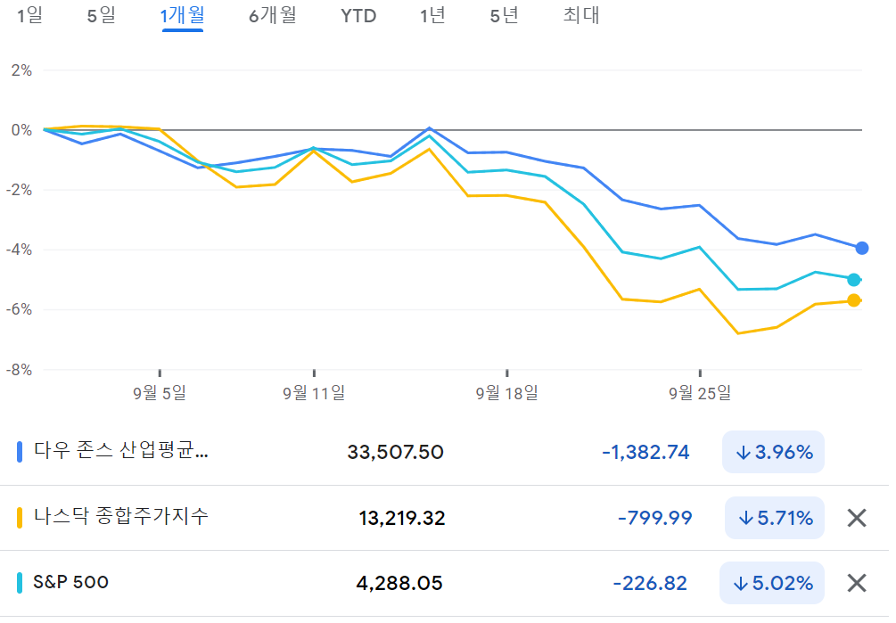 [2023.09] 월간 미국 증시 정리 #나스닥 5.71%↓, #S&P500 5.02%↓, #다우 3.96%↓