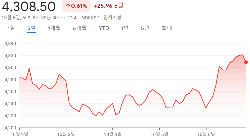 - S&P 500 4,308.50 +0.61% +25.96 5일