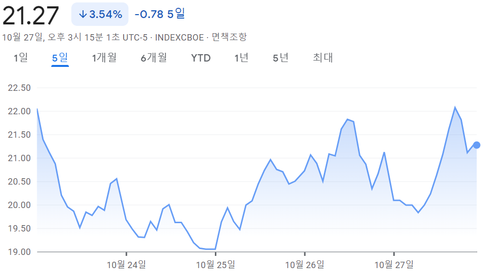 3. VIX 지수 (공포지수) : 대체로 VIX가 높아지면 주가는 폭락하는 경향.
