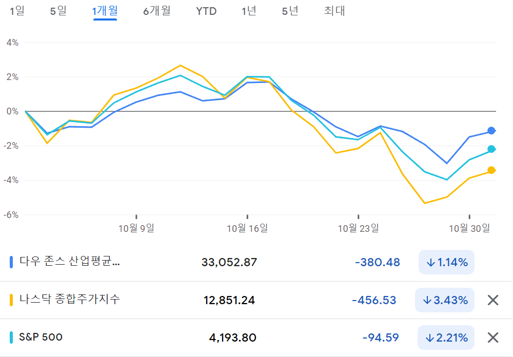 [2023.10] 월간 미국 증시 정리 #나스닥 3.43%↓, #S&P500 2.21%↓, #다우 1.14%↓