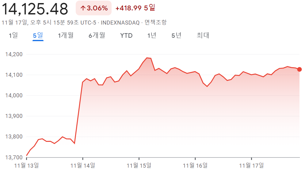 - 나스닥 14,125.48 +3.06% +418.99 5일