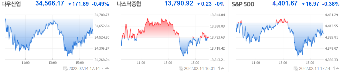 미국 뉴욕증시는 연방준비제도(연준·Fed)가 공격적인 긴축에 나설 수 있다는 우려와 러시아가 우크라이나를 침공할 수 있다는 공포 속에 대체로 하락했다. 14일(미 동부시간) 뉴욕증권거래소(NYSE
