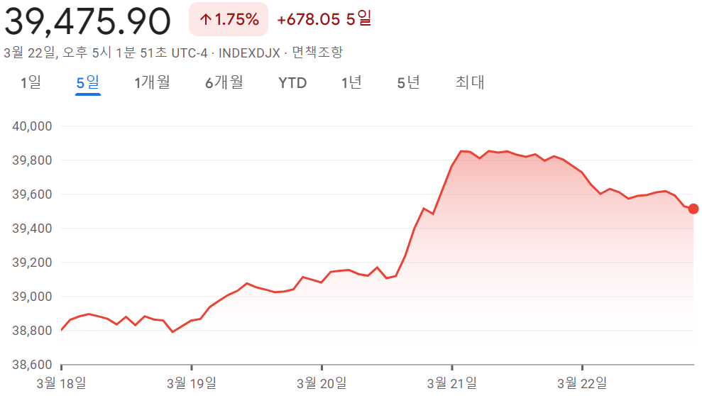 [2024.03.18~03.22] 주간 미국 증시 정리 #나스닥 1.58%↑, #S&P500 1.45%↑, #다우 1.75%↑