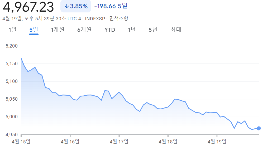 - S&P 500 4,967.23 -3.85% -198.66 5일