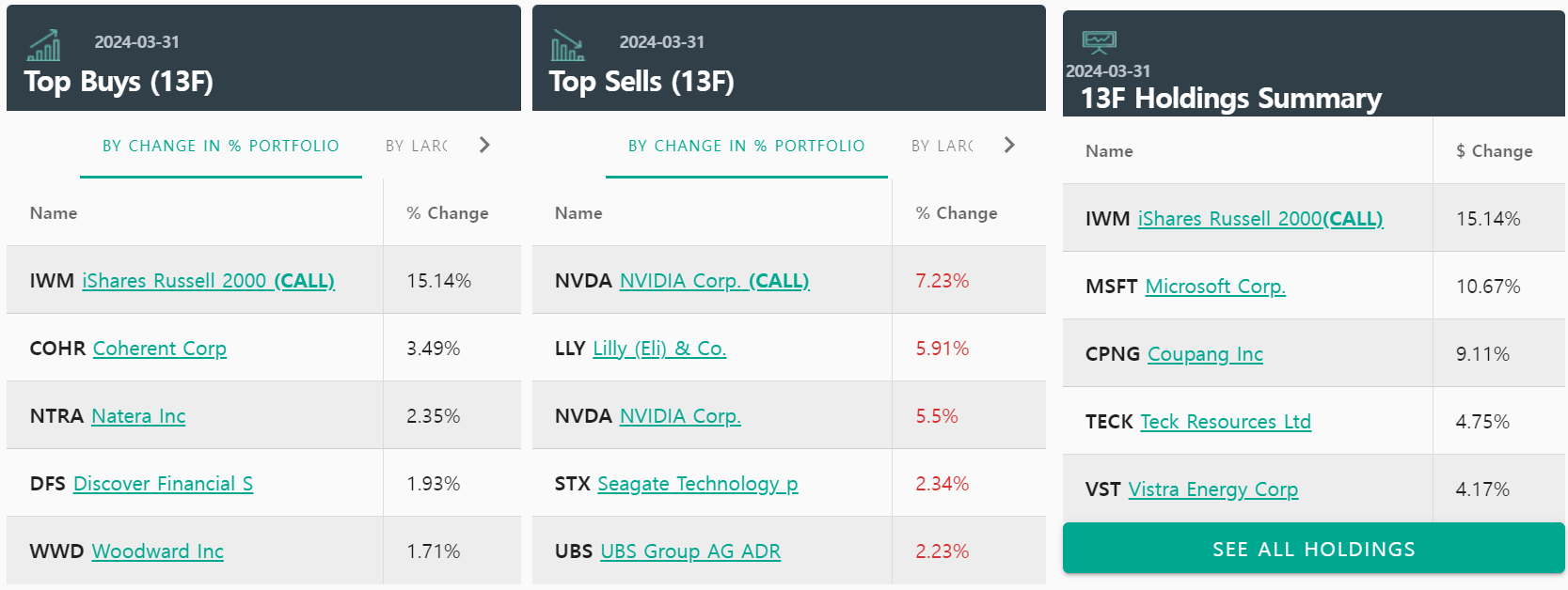 13F 은 자산운용 규모가 1억 달리 이상인 기관투자자들이 분기마다 미국 증권 거래 위원회에 제출해야 하는 문서입니다.