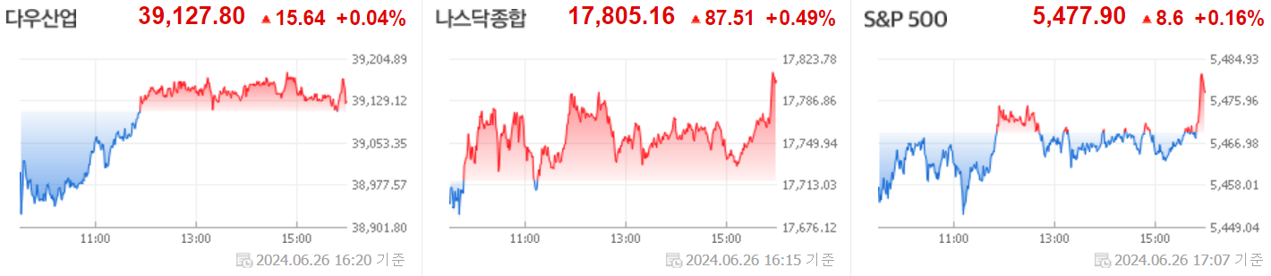 26일(현지시간) 뉴욕증시는 소폭 상승 마감했다. 이날 다우존스 30산업평균지수는 전거래일 대비 0.04% 오른 3만9127.80에 거래를 마쳤다.S&P500지수는 0.16% 오른 5477.90을, 기술주 위주의 나스닥지수는