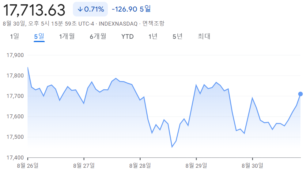 [2024.08.26~08.30] 주간 미국 증시 정리 #나스닥 0.71%↓, #S&P500 0.12%↑, #다우 0.48%↑
