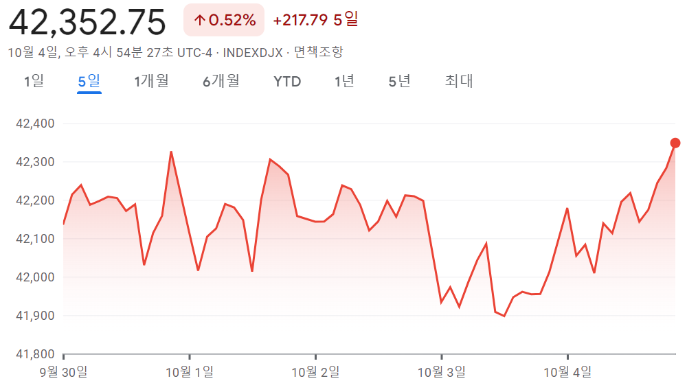 [2024.09.30~10.04] 주간 미국 증시 정리 #나스닥 0.089%↑, #S&P500 0.40%↑, #다우 0.52%↑