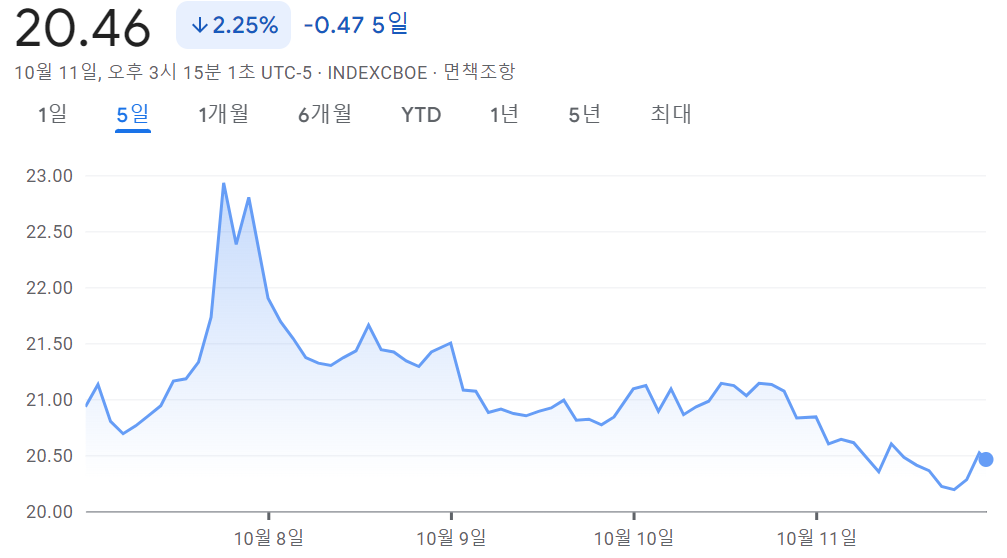 3. VIX 지수 (공포지수) : 대체로 VIX가 높아지면 주가는 폭락하는 경향.