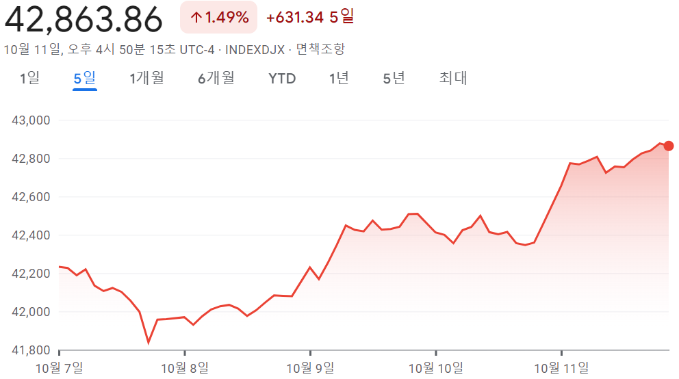 [2024.10.07~10.11] 주간 미국 증시 정리 #나스닥 1.72%↑, #S&P500 1.51%↑, #다우 1.49%↑