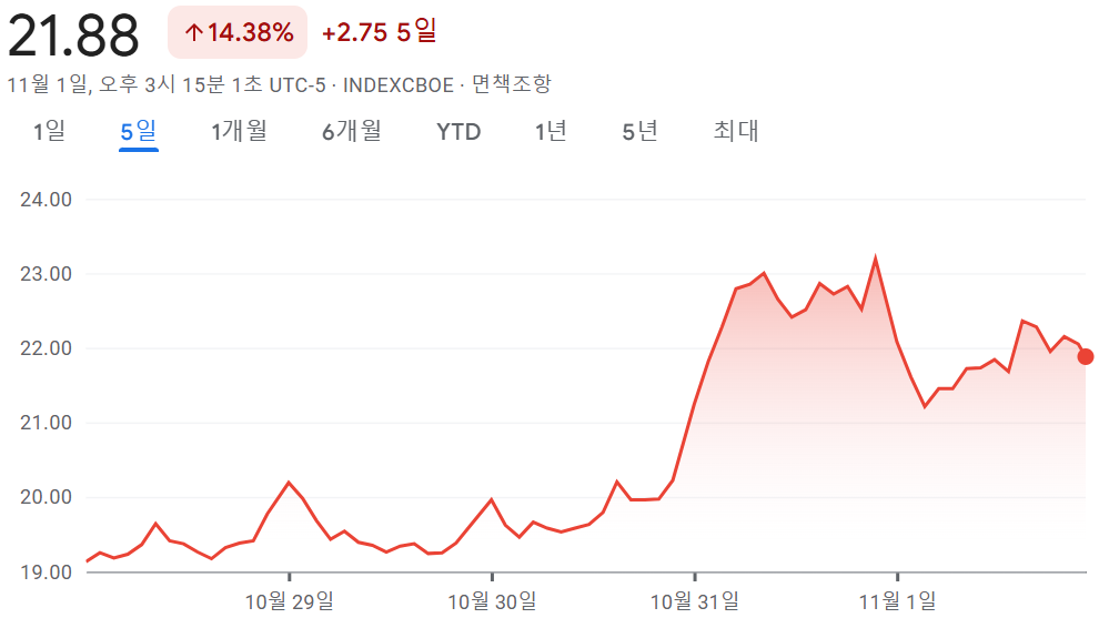 3. VIX 지수 (공포지수) : 대체로 VIX가 높아지면 주가는 폭락하는 경향.
