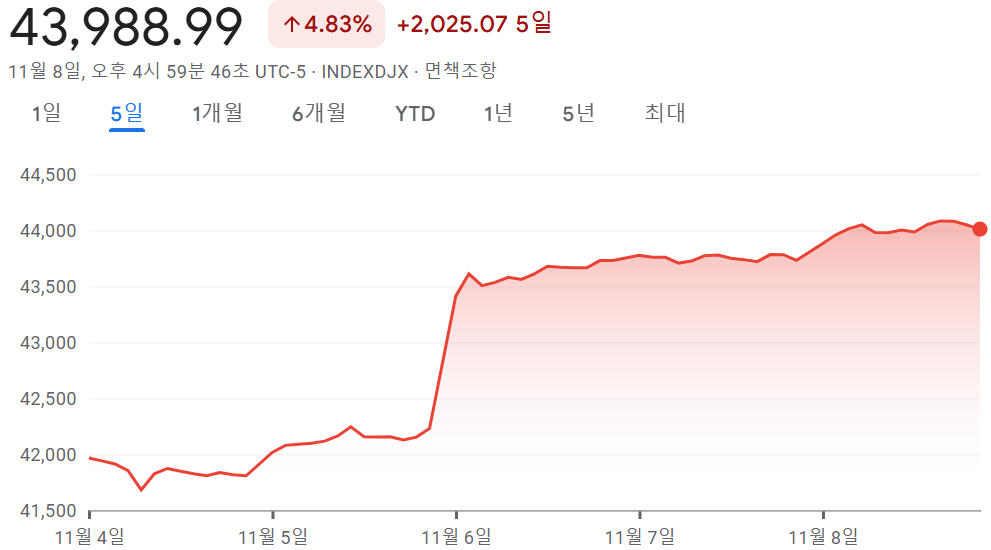 [2024.11.04~11.08] 주간 미국 증시 정리 #나스닥 5.84%↑, #S&P500 4.59%↑, #다우 4.83%↑