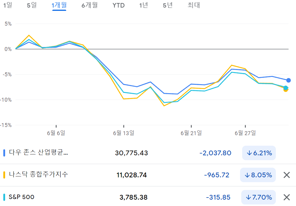 [2022.06] 월간 미국 증시 정리 #나스닥 8.05%↓, #S&P500 7.70%↓, #다우 6.21%↓
