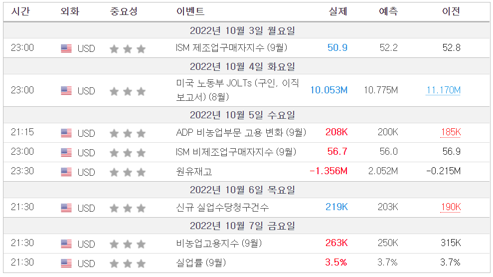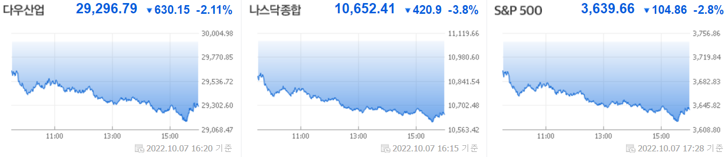 [2022.10.08] 미국 주식 정리 #9월 고용·연준긴축 우려에 하락…나스닥 3.8%↓, #OPEC+ 충격에 유가 4.7% 폭등..100달러 돌파 초읽기, #연준 11월에도 '자이언트 스텝' 예상, #주요뉴스