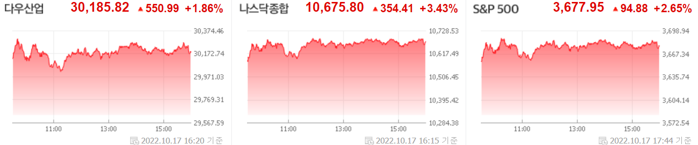 증권 > 해외증시 뉴스: 지난 주 어려운 시간을 보낸 미국 뉴욕증시의 주요 지수가 17일(현지 시간) 일제히 상승했습니다. 나스닥이 3.43% 오른 것을 비...