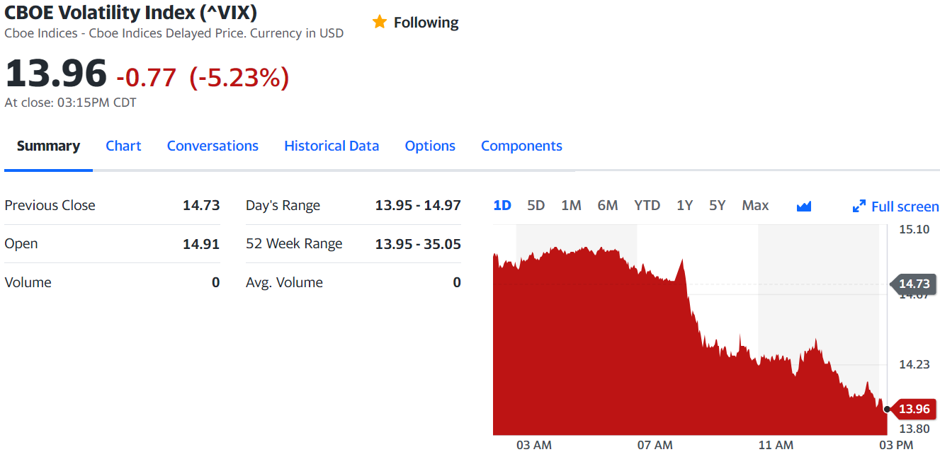 - VIX 지수 20 이하 : 과매수 구간 매도 고려 (흥분 구간)