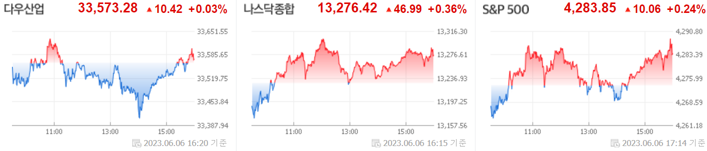 [2023.06.07] 미국 주식 정리 #경기침체 전망 약화에 상승…나스닥 0.36%↑, #美SEC 바이낸스 이어 코인베이스도 저격…주가 12.09%↓, #강세론자 톰 리 “증시 20% 급등할 수 있는 세 가지 조건”, #주..