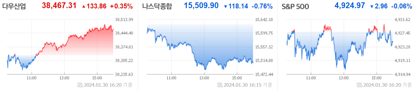 [2024.01.31] 미국 주식 정리 #실적ㆍFOMC 앞두고 혼조…나스닥 0.76%↓, #마이크로소프트 시장 상회 실적 발표... 주가는 약보합, #기대 못 미친 실적... 알파벳(구글) 주가 시간외 4% 하락