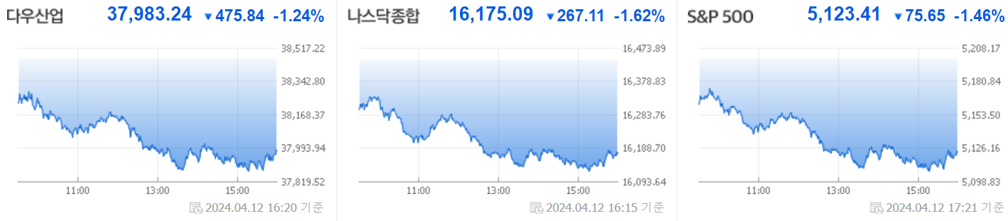 [2024.04.13] 미국 주식 정리 #이란·이스라엘 충돌 위험에 급락…나스닥 1.62%↓, #국제금값 온스당 2천400달러 돌파…사상 최초, #“엔비디아는 너무 올라 부담스러운데”…저평가 미국주식 뭐 있..