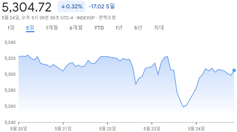 - S&P 500 5,304.72 -0.32% -17.02 5일