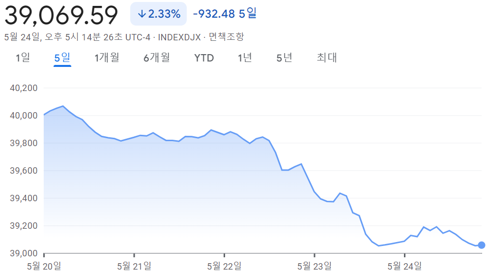 [2024.05.20~05.24] 주간 미국 증시 정리 #나스닥 0.7%↑, #S&P500 0.32%↓, #다우 2.33%↓