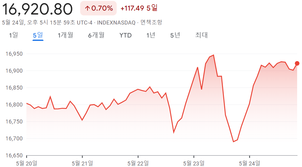 - 나스닥 16,920.80 +0.70% +117.49 5일