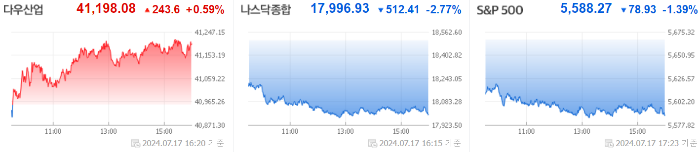 [2024.07.18] 미국 주식 정리 #기술주 투매 속 반도체 최악의 하루…나스닥 2.77%↓, #ASML 2Q 호실적에도 ‘미국 수출 감축’ 우려…주가 12%↓, #미국 반도체 수출 통제 '구멍'…MS·구글 중국에 엔비디아 AI 서비스